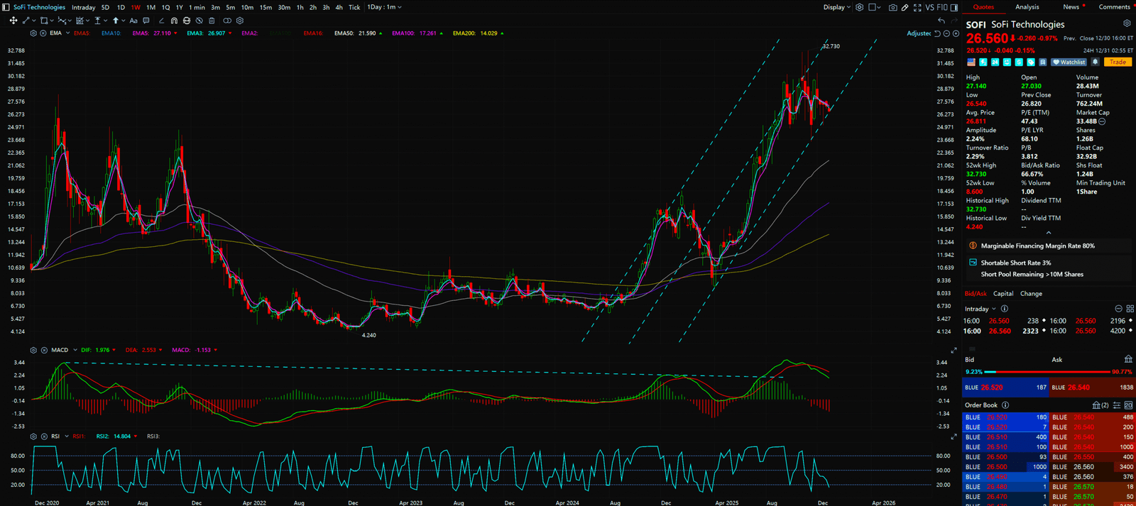 - 圖表解碼: SOFI 波動性大,但圖表顯示低點不斷抬高 (Higher Lows)。這是一個蓄勢待發的 Ascending Triangle。
