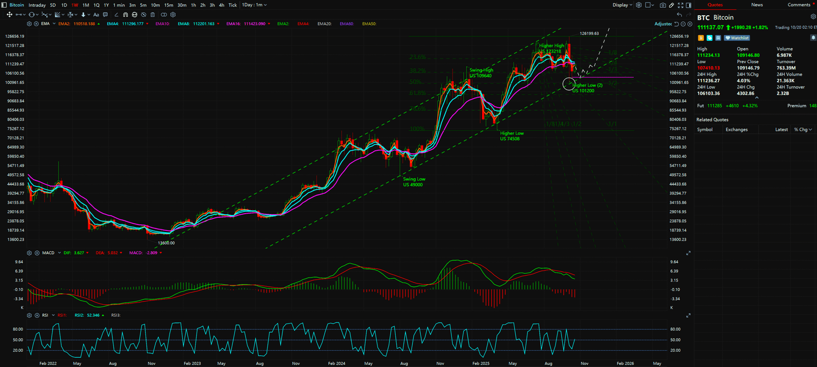 - 以下所有技術分析,均基於 2025年10月20日, 14:34 (UTC+8) 所鎖定的價格快照:BTC = US$110,500。
